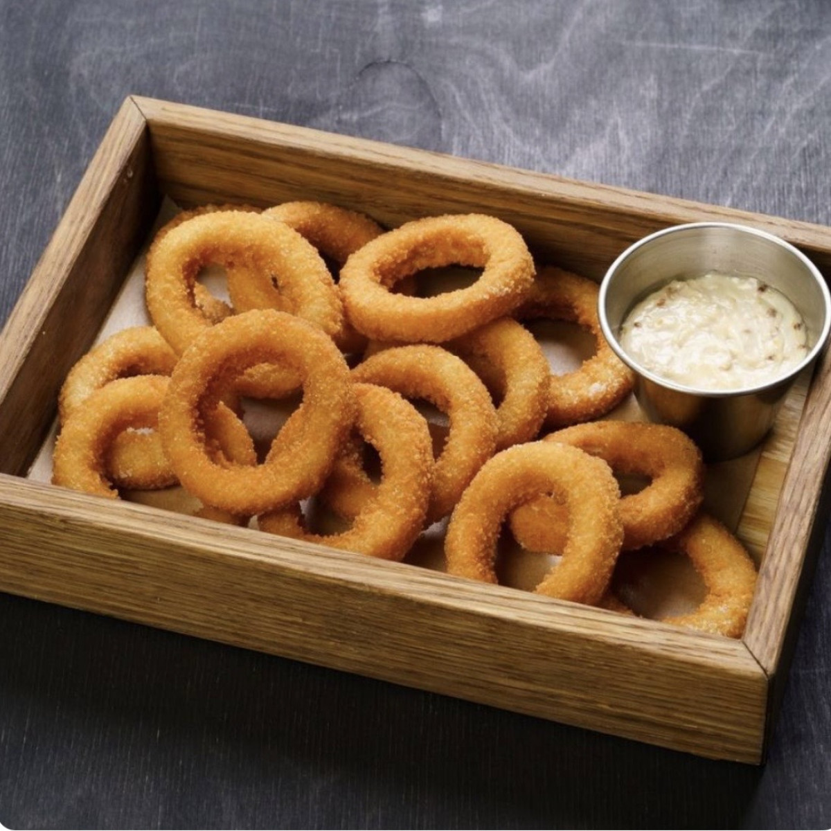 тонкие кольца из рубленного лука в панировочных сухарях, соус цезарь