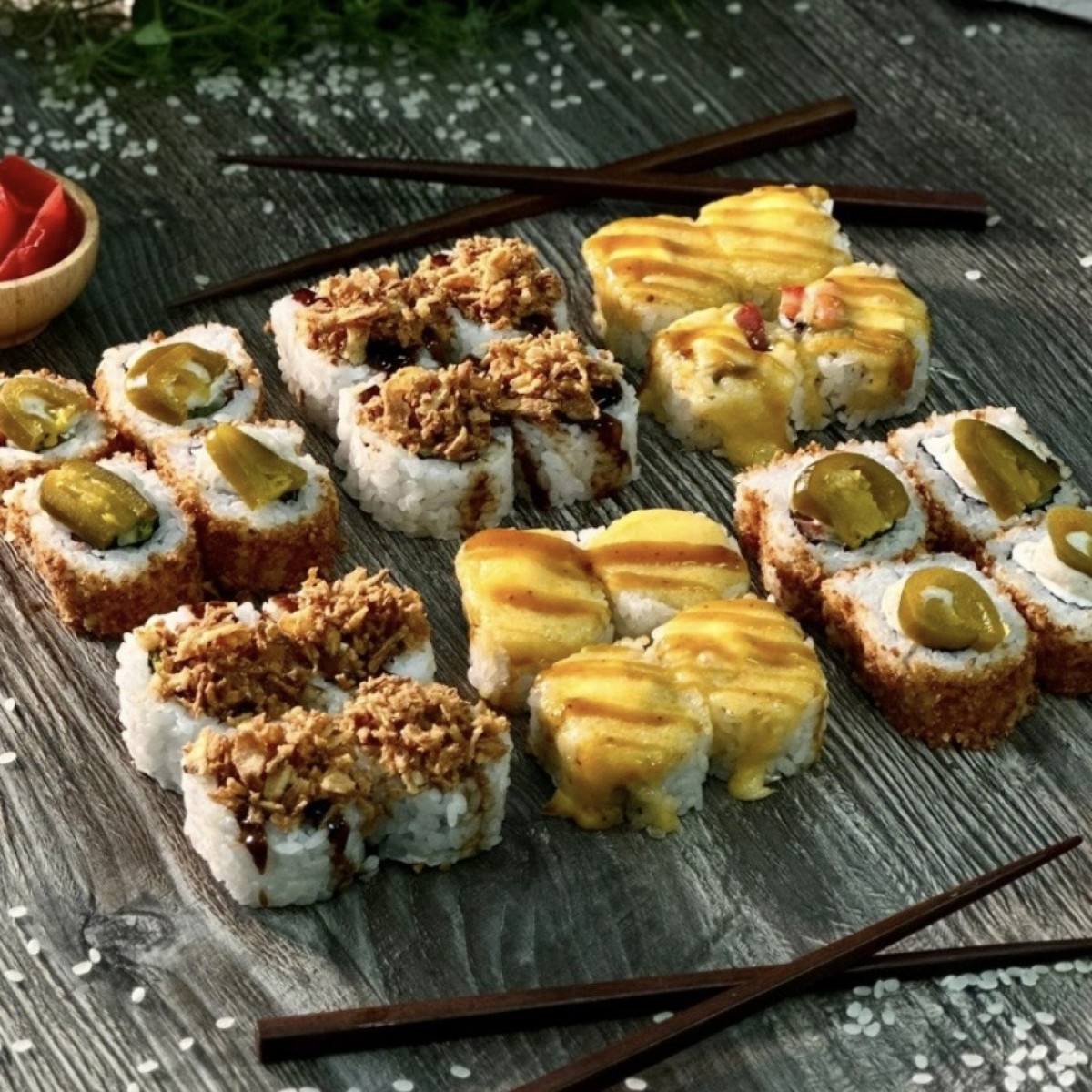 КРАНЧ ВЕГАН-нори,рис,помидор,лист салата,огурец,креметте,соус унаги,кранч лук; КРАНЧ БЕКОН-нори,рис,креметте,бекон,огурец,кранч лук,соус цезарь,халапеньо; ТОРИ ЧИЗ-нори,рис,креметте,куриное филе, помидор, моцарелла,соус манго-чили